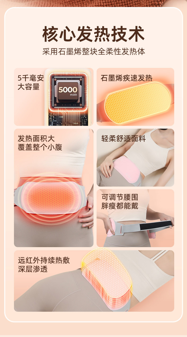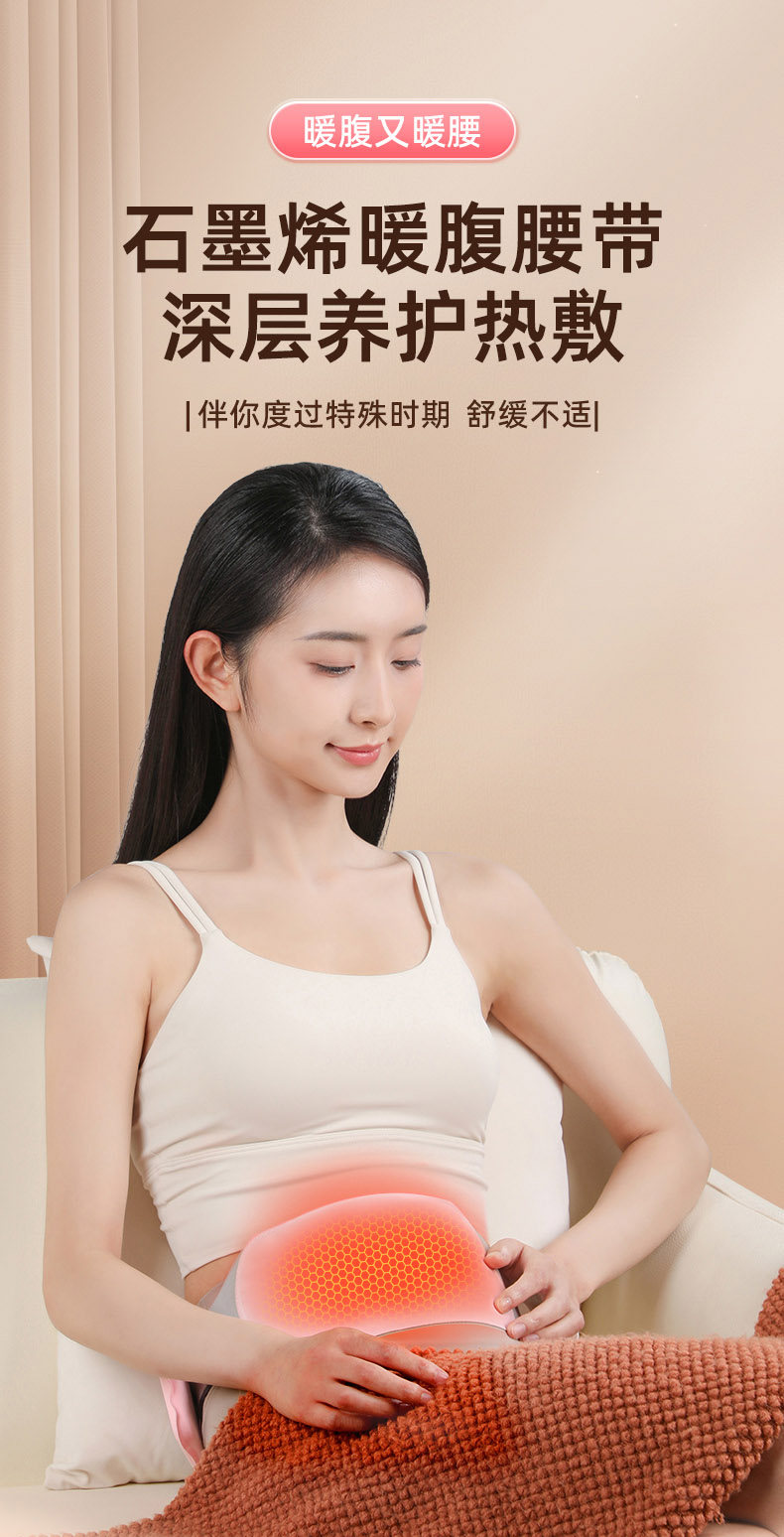 采用石墨烯技术,瞬间温暖。发射6-14μm远红外波,深度缓解疼痛。三档温热设置,深层缓解经期期间引起的腹痛,腰部酸痛,搭配柔软透气面料,尺寸可调节适应不同腰围。易于携带,居家、工作或旅行皆宜。
